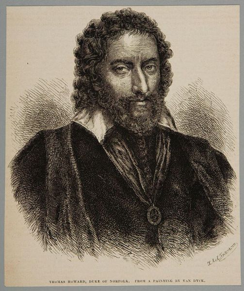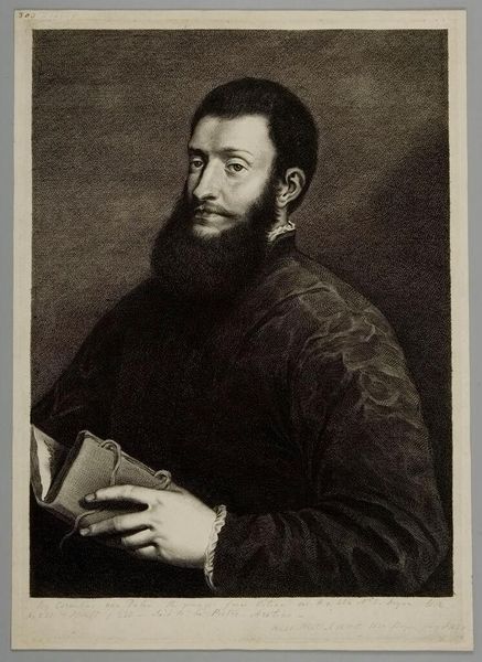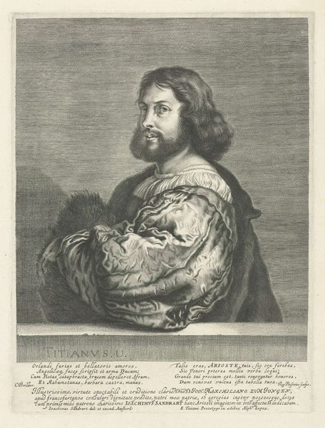 Curator: Looking at this portrait, I immediately feel a sense of somberness, maybe even resignation in the subject's eyes. Editor: This is Cornelis van Dalen the Younger's engraving of Giorgione da Castelfranco. Van Dalen, who lived from 1638 to 1664, produced this print, which now resides at the Harvard Art Museums. The image feels like a study in contrasts. Curator: Contrasts how? The face is soft, even vulnerable, but then that beard is so imposing. It frames his face like a mask, obscuring rather than revealing. Editor: Exactly. And considering the politics of portraiture then, think of the artist's choice to depict Giorgione in this manner. It challenges ideas of authority and status, doesn't it? Curator: It's difficult to know, especially with an artist who died so young. But I agree, the work demands that we look beneath the surface, questioning what visual signifiers truly mean. Editor: Indeed. This engraving encourages a dialogue about identity, representation, and the stories we tell ourselves about the past.