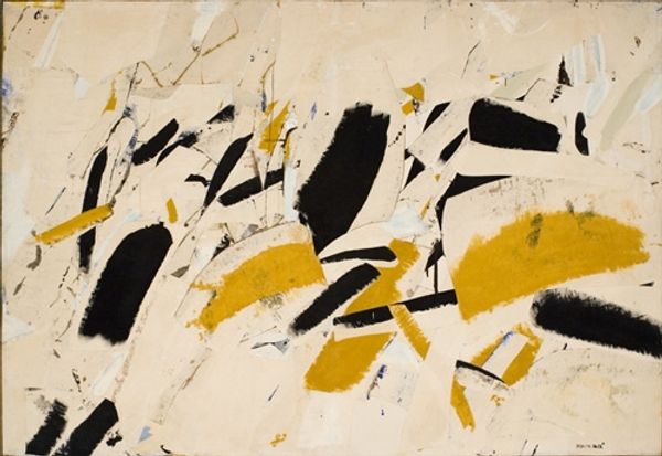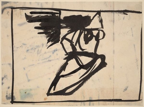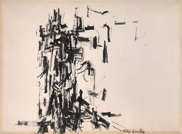 Curator: Here we have an untitled work by Franz Kline, created around 1960, rendered in ink. My immediate impression is a clash – bold, almost violent. Editor: Violence is interesting. To me, it reads more like architectural beams, scaffolding, caught mid-construction or mid-demolition. You see the labor right there in those broad strokes. Curator: Absolutely. The physicality of applying ink in such a gestural manner is undeniable. Look at the composition, it really guides your eyes through the processes. Kline wasn't just depicting, he was enacting. It becomes less about representation and more about, dare I say, documentation of an action. Editor: And those actions are all about the body, aren’t they? He’s using his entire body as an instrument, which I like! You can practically feel the weight of his arm as he moves across the surface. There's even something calligraphic about it to me. A language only he knows. A dance across the page... or the beam. Curator: You mention language, which prompts thoughts on influence: the visual weight of machinery after the war perhaps filtered through an Abstract Expressionist lens, but not explicitly representational. More like the afterimage of industry, now interpreted. Editor: And what a bleak industry to render in mostly black and some warm umber against the raw canvas! This choice in the economy of color reflects scarcity and the stark choices available during reconstruction of any sort. Like, "I had black ink today, and paper". Ha! Curator: A rather poetic interpretation of his palette. Makes me reflect on how much the limited materials really focuses your attention on mark-making itself, on how Kline manipulated viscosity, pressure and time. Each stroke exists because a set of economic, emotional, and even environmental situations happened in the artist's vicinity! Editor: I know, right? From these simple supplies comes so much impact! The essence of minimalist choices with a grand outcome—but there’s something so revealing about that limited toolkit that makes it speak even louder today. A good little snapshot of its cultural moment that’s still super accessible in the present. Curator: Agreed. We've explored the layers of materiality, method, meaning within Kline's compelling work today. A lot of that emotional weight hangs on simplicity, doesn’t it? Editor: It truly does, doesn't it! Like a song pared back to a single guitar. The more raw materials there are available to begin, the harder the real and raw art has to try. And Kline here makes you want to dance even to hard times.