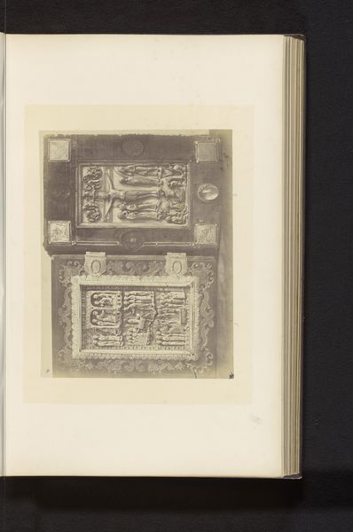 Curator: Here we have an early photographic print capturing two sides of an Etruscan terracotta sarcophagus, dating from before 1874. The photo documents carved relief panels on the sarcophagus, depicting scenes of considerable narrative complexity. Editor: The mood it evokes is incredibly somber. Seeing it in this early photographic form, a precursor to modern documentation, intensifies the feeling of gazing into a distant, weighty past. The grayscale and the shallow depth really draw out the texture of the stone or clay. Curator: Exactly. Considering the Etruscan culture was absorbed by the burgeoning Roman empire, these funerary objects serve as crucial material records that challenge a purely Roman-centric historical narrative of the region, giving agency and visibility to pre-Roman identities. Editor: Let's consider the material reality for a moment. Terracotta, essentially fired earth, suggests a widely accessible material. Did its accessibility influence funerary practices and who had access to elaborate burial rituals? The level of detail suggests a substantial amount of skilled labor, the carving seems very labor-intensive. Curator: That’s insightful. The materiality indeed informs accessibility. While terracotta was relatively common, the artistry involved certainly signifies elite status. These images also reveal aspects of gender and societal roles of the interred, with scenes possibly portraying their status and family lineages. We see visual indicators of power within these panels, even in these fragments. Editor: How fascinating. This photographic documentation itself speaks volumes about the historical and material value assigned to such artifacts even in the 19th century. It represents an attempt to capture and circulate the essence of a civilization through the very act of reproduction and labor. It makes me question the motives of those making and preserving. Curator: Absolutely, the history of archiving and photographing becomes woven into the very understanding of the culture represented here, allowing contemporary eyes to participate in the afterlife of those long since past. Editor: Seeing these sides of the sarcophagus presented in photographic form has highlighted how labor and social practices intertwine and reveal ancient and modern values. It is nice to imagine that through art history our roles now do as well.
