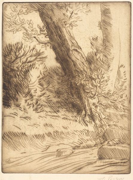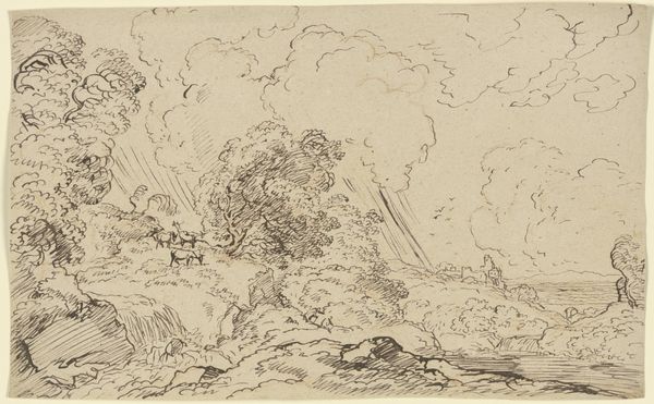 Editor: This is an ink drawing called "Landscape with Figures" from somewhere between 1600 and 1700, currently housed in the Met. The light washes of brown ink give the scene an ephemeral, dreamlike quality. How do you interpret this work in terms of its visual structure? Curator: This work exhibits a deliberate exploitation of line and form. Note how the artist utilizes contour lines and hatching to define the shapes of the figures, foliage, and landforms. The stark contrast between the dark, densely worked foreground and the lighter, more atmospheric background creates depth. Do you notice how the composition directs your eye? Editor: Yes, my eye is definitely drawn from the lower left corner up and across to the hazy background with what appears to be some kind of buildings or sailboats. What's interesting to me is that it doesn't seem like the artist was concerned with perfect representational accuracy. Curator: Precisely. The artist seems less concerned with mirroring reality than with creating a visually stimulating arrangement of shapes and tones. Consider, for instance, how the sweeping lines of the tree branches mirror the curves of the hillside, establishing a visual rhyme across the composition. These relationships create a sense of visual harmony. Editor: So, it’s less about what is depicted and more about how it’s depicted. Does that resonate with the probable function of a landscape drawing like this one? Curator: Exactly. Its functionality lies primarily in the exercise of visual language. The emphasis on form, line, and tonal relationships transcends any simple depiction of a landscape. Ultimately, the work encourages a mode of seeing divorced from narrative or symbolic intent. Editor: This way of focusing on the pure forms and the relation of parts has really helped me to look at this piece anew. Thanks! Curator: Indeed. Deconstructing the image to examine the relationship of line, tone, and composition refines the act of looking and generates deeper aesthetic understanding.
