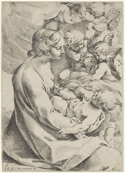 Editor: Here we have Albrecht Durer’s "The Virgin Nursing the Child," created in 1519 using ink as a print. The intense detail achieved in ink is amazing. I am curious about your reading of the composition, how do you interpret this work through its formal elements? Curator: Note the masterful control of line and form. Durer's use of hatching and cross-hatching creates a tonal range that suggests volume and depth, essential elements in understanding spatial relationships in visual arts. Observe the texture implied on the fabrics and the skin; what does this articulation communicate to you? Editor: I guess I can see how different forms communicate contrasting concepts; how the sharp dark lines of the cross-hatching and the circular patterns behind the two figures form the contrast that leads to the idea of foreground and background Curator: Precisely. Also, let’s explore the central composition; a symmetrical harmony in a relatively static yet intimate portrait. What effect does this formal choice have on the reading of subject? Editor: So because there's balance with no single overwhelming aspect of the drawing to guide the viewer in particular, and also the lack of dynamics due to both characters occupying relatively static postures the intimate feeling of nursing that's communicated in such manner. What would be its objective? Curator: Good. It removes excess of context for contemplation on its core meaning; through its balance and central theme of nurturing and intimacy in its symmetrical approach, the subject's presentation leads to its contemplation, as if a simple observation. How do we know is "The Virgin?" Are we biased? Editor: That’s an interesting point! Looking closely, the halo surrounding The Virgin alludes to just that, The Virgin Mary, the symbolism of Divinity Curator: Indeed. In conclusion, through Durer’s control of form, balance, symmetry and delicate textures this piece guides to the contemplation of the subject. It relies on the reading of light and shadows in combination with divine symbolisms to portray The Virgin Nursing The Child. Editor: I see, thank you for explaining all of that; it helped me grasp what makes a piece such as "The Virgin Nursing the Child" more meaningful through Durer’s technique.
