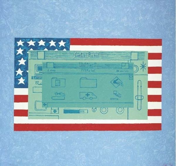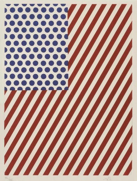Editor: So, this mixed-media artwork is titled "The Presidential Suite. JFK," created by Billy Apple in 1964. The American flag is composed of repeated photographic portraits of John F. Kennedy, and there's a kind of solemn, repetitive quality about it. How do you interpret this work purely from its visual elements? Curator: Note the formal tension. The grid of portraits, mimicking the stars, uses cool, desaturated blues, creating a stark contrast with the vivid reds of the stripes. Do you find that contrast, created through line and color, suggestive? Editor: It makes me think about disruption. The rigid structure of the flag is there, but then broken up by the repeating faces. Is that what makes it pop art? Curator: Precisely. Apple disrupts our expectation. This juxtaposition compels us to look beyond the symbolic meaning and examine the aesthetic structure. The texture introduced by photographic reproduction also impacts our perception. Would the message be the same if Kennedy’s image was hand-painted, softening its appearance? Editor: Probably not. The repetition, the printing… it’s like a newsreel, forcing the image into our collective consciousness. How does the choice of media amplify that? Curator: Mass media techniques of the day amplified a kind of cool detachment from something so immediate. The smoothness and flatness enhance the flag as an object. It compels viewers to acknowledge the mediated quality of historical figures and their iconic representation. Are you following me? Editor: I think so. By dissecting the visual presentation, we learn a new appreciation of the art. The artwork’s strength lies in these formal decisions of media, texture, color and proportion, not the President, in isolation. Thanks! Curator: Indeed. We understand how line and composition contribute meaning. Excellent.