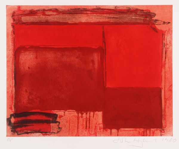 John Hoyland’s untitled artwork presents a vibrant arena of color, where bars of blue and red flank a central field of warm red tones, anchored by a stroke of yellow. These vertical and horizontal divisions carry echoes of architectural structure, reminiscent of how, in early Renaissance paintings, the cross was presented as the intersection of divine and earthly realms. The color red itself, often associated with passion, blood, and sacrifice, takes on a deeper emotional weight, evoking a sense of primal energy. Consider how the color fields resonate with cave paintings—crude shapes, with their basic forms and urgent colors meant to speak to our deepest instincts and primal urges. The colors, laid bare, allow us to access the collective subconscious that influences our interpretations and emotional responses. Hoyland’s abstract language, with its deep roots in the history of human expression, provides a mirror reflecting the timeless drama of human emotions and desires. These gestures resurface, evolve, and take on new meanings across history.