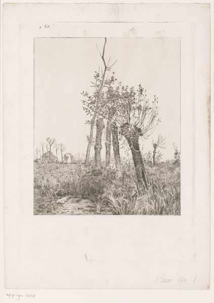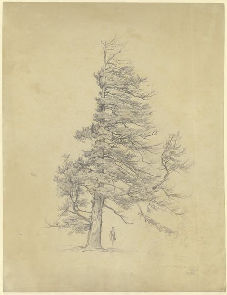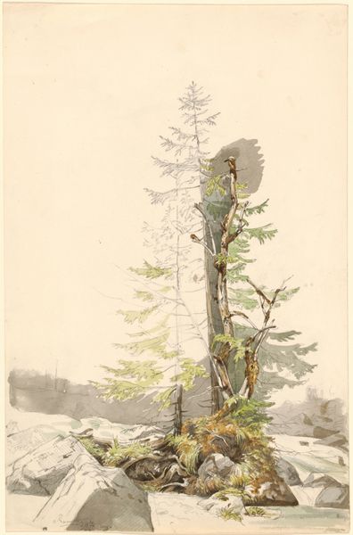 Curator: This graphite drawing, a print actually, is Robert Swain Gifford's "Old Trees at Naushon Island," dating to 1865. Editor: My first impression is one of somber dignity. There's a quiet resilience in these old trees, rendered with incredibly delicate lines. It makes you feel like you are standing in a silent cathedral. Curator: Gifford, a key figure in the Hudson River School, captures a very specific environment. Look at the detail – he meticulously renders the textures of the bark and the low shrubs around the trees. There's a real emphasis on portraying the natural resources available and the physical realities of the locale. Consider how these materials were harvested, how the printmaking process itself becomes an extension of Gifford's experience of the land. Editor: Absolutely. Beyond the meticulous execution, I see symbolic weight here. These are old, possibly dying trees. Look at the birds taking flight, suggesting a passing of time, a migration. Trees often function as symbols of life and death, and this drawing really resonates with the romantic idea of nature’s grandeur tinged with melancholy. Curator: Gifford's work, particularly within the Hudson River School context, raises interesting questions about landscape, ownership, and industrial production. Remember, at this time, lithography allowed images like this to circulate widely, democratizing access to landscape views. But also acting as tools for selling an image, almost as an advert for untouched and potentially developable nature. Editor: An interesting contradiction! It highlights the duality of man’s relationship with nature. We see beauty, but also potential resources. Those trees, beautiful in their detail, might represent lumber to someone else, right? I find that inherent conflict intensely moving. Curator: Exactly! The drawing exists within a network of material practices. Everything from the graphite used to create the drawing to the paper and ink to mass printing relates to the world around the landscape itself. Editor: And to carry that thought forward – Gifford is taking these old and naturally deteriorating things and fixing it onto something flat and enduring; it takes on its own life, really. Thanks for highlighting the layers in this work. Curator: My pleasure. It reveals a surprising depth within what at first seems like a very simple depiction.