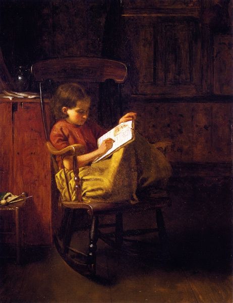 Curator: "A Girl by the Oven," painted in 1894 by Elin Danielson-Gambogi. A quiet scene rendered in oil. Editor: Immediately striking! The painting evokes a feeling of stark, melancholic stillness, and the warm glow from the stove provides a strong contrast with the sombre palette. The texture looks so thick in places. Curator: Absolutely. Gambogi was a Finnish artist who studied in Paris. She's known for intimate genre scenes and portraits often depicting women, aligning with broader trends in European art where female artists sought new avenues for representation. It reflects Intimism, but there is also a current of Realism, wouldn't you say? Editor: Indubitably. Look how the composition directs your eye; the girl is almost framed by the darkness of the room, and her figure has an intentional, muted harmony. Her gaze leads us, compelling the viewer, it speaks volumes about the painter's craft. The light feels studied, and the texture enhances the humble domestic subject. Curator: Consider, too, the political context. This painting emerged during a period of rising Finnish nationalism. Artists played a key role in forging a national identity, exploring everyday life, and promoting values such as resilience and connection to the land. Gambogi, with this piece, participates in this process of cultural nation-building by painting such scene, imbuing it with deeper meanings, that went on display. Editor: I appreciate the way that the visible brushstrokes add a sense of raw, unpolished honesty. See how light flickers off the metallic surfaces? It shows how effectively the light interacts across different material planes, that's very good. Curator: In conclusion, it is a depiction of the individual and the socio-political backdrop. The artwork invites reflections on female identity and everyday life, not only during its historical moment but that resonates still with today's viewer. Editor: Yes, it is an extraordinary exploration of contrasts of both light and dark. "A Girl by the Oven" captures a solitary moment, elevated by its delicate treatment of light and shadow. The artist created a world within this scene and rendered it skillfully.