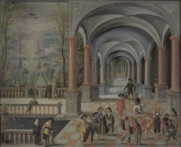 Dirck van Delen’s "A Seven-Part Decorative Sequence: A Gallery," is an oil painting showcasing both his mastery of perspective and the cultural values of his time. The meticulous detail in rendering the architecture is striking. Note the marble columns, checkerboard floors, and classical sculptures – all achieved with careful brushwork and an understanding of light and shadow. While these materials aren't physically present, Van Delen convinces us of their weight and texture through skillful illusion. The presence of wealthy figures strolling through this gallery suggests a society that values art and leisure. The architecture itself speaks to power and status, reflecting the patron’s desire to display wealth and sophistication. The labor involved in creating such an elaborate space is hidden, yet it’s essential to the scene's overall impression. Van Delen's work blurs the line between fine art and craft. He invites us to consider how both contribute to the construction of cultural meaning.