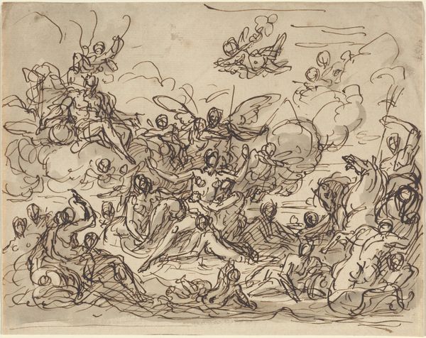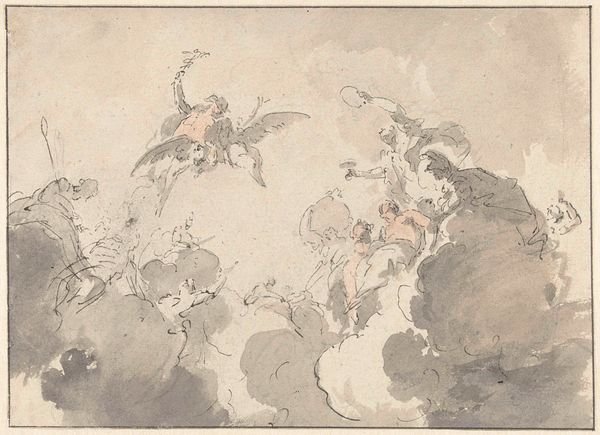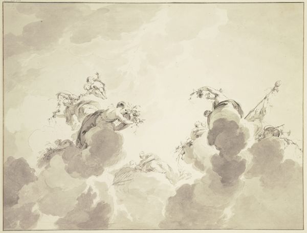 Editor: This is "Ontwerp voor plafondschildering," a ceiling painting design by Jacob de Wit, from around 1705 to 1754. It's a pen and ink drawing, quite a contrast to what the finished piece might have been! It feels so light and airy, almost like catching a glimpse of a dream. What do you see in this piece, beyond just a preparatory sketch? Curator: Well, what strikes me immediately is how de Wit is playing with the enduring symbolism of the heavens. Even in sketch form, we can discern figures seated on clouds, perhaps personifications of virtues or celestial bodies. Note the globe held aloft – a common symbol representing worldly power, knowledge, and governance. Editor: I see! So, these aren't just decorative figures floating around, but figures loaded with symbolic meaning intended for the viewer? Curator: Precisely! Consider that these images would have been incorporated into a larger architectural space. The artist uses culturally inherited memory by invoking allegorical representations, creating a dialogue between the viewer, the architecture, and the painting itself. Can you imagine how the setting would affect the reading of this artwork? Editor: I guess seeing this on a grand ceiling versus a piece of paper changes the impact. It's like he's offering a symbolic representation of idealised order above. The weightiness is definitely toned down by the medium of the sketch, like catching a fleeting thought! Curator: And there, in that tension, lies the enduring fascination with preparatory drawings like these. They are echoes of the original intent and speak of transformations in how we experience these allegories over time. Editor: I hadn't thought about the transformations in how allegories are experienced across time! It makes you think about what symbols we're building up today for future generations to interpret. Thank you! Curator: Indeed! The journey of an image across time, a conversation with the past… That’s the magic, isn’t it?