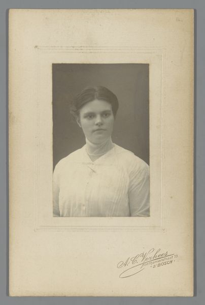 Curator: This arresting image, taken between 1905 and 1906, is entitled "Portret van een onbekende jonge vrouw met vlecht," or "Portrait of an Unknown Young Woman with Braid," attributed to Carl Rosén. What’s your initial impression? Editor: It's like stepping into a sepia-toned dream, all delicate lace and longing looks. The girl, or young woman, is centered, staring right back at us, and yet there's something almost mournful about the image. What's your take, formally speaking? Curator: The composition adheres to a somewhat standard portrait structure. The subject's gaze and posture establish an intimate connection, challenging the detached viewer. The photographic focus softens, directing attention to the nuances of the face while simultaneously obscuring distracting elements. Note the light – how it sculpts form. Editor: And isn't that braid something? Thick and almost theatrically long, like a tangible symbol of her youth, maybe even a bit of her story physically manifested and dangling. Curator: Indeed. From a semiotic perspective, the braid becomes a powerful signifier of femininity and, as you pointed out, youth. Combined with the dress – a darker material trimmed with intricate lacework – these elements create a complex visual narrative that speaks to both societal norms and individual expression of the period. Editor: I feel a whisper of Art Nouveau here, that soft curve of hair, the almost illustrative feel of the shadows... and a deeper question, a timeless mystery about identity and connection. Who was she? Curator: The formal elements hint at answers, although her inner life, as you’ve suggested, remains delightfully and maddeningly elusive. This portrait encourages viewers to engage actively, drawing them into its formal complexities and inviting subjective projection. Editor: Exactly. It's an echo across a century, leaving more with us than it reveals, lingering like the scent of old photographs in a dusty room. What is so fascinating in old photographs is that sometimes you can read someones life just through an expression. I wish I could ask her "what was?" Curator: A beautiful sentiment, Editor. One could almost write a short play about her, given that evocative possibility.