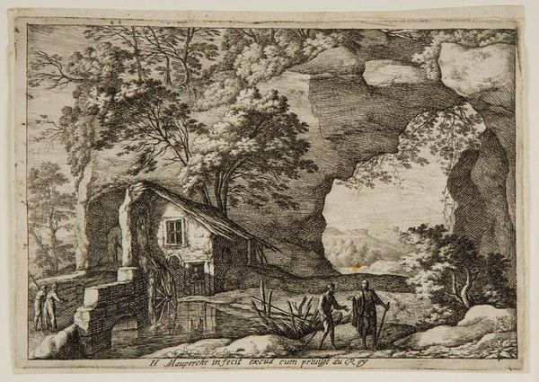 Curator: This is Jacob van Ruisdael’s print, "Little Bridge." Notice the intricate detail achieved through etching. Editor: Immediately, I'm struck by the composition—the dilapidated structure juxtaposed with the pastoral scene creates a compelling tension. Curator: Indeed. Ruisdael, born in 1628, often depicted the Dutch countryside, but this piece feels more melancholic, perhaps hinting at the impermanence of human construction against the backdrop of nature's enduring presence. Editor: The stark contrast in values, from the deep blacks to the delicate grays, emphasizes the texture of the building and the surrounding foliage. It's almost as if the artist is exploring the dialogue between decay and growth. Curator: Consider also how such imagery resonated with the urbanizing Dutch population of the 17th century, a yearning for the rural past as cities grew. Editor: Ultimately, this print shows us how formal elements work together to create meaning and emotion, reflecting on themes that are very much situated in history.