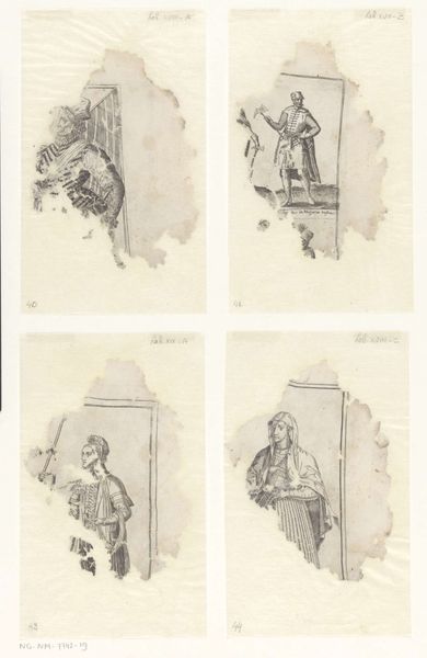 Curator: These captivating fragments before us, "Fragmenten van prenten met wereldlijke en geestelijke klederdrachten," originate from the period between 1581 and 1596. They’re attributed to Abraham de Bruyn, an artist whose work provides fascinating glimpses into the clothing of the era. Editor: Wow, looking at these delicate remnants, I’m struck by their almost ghostly quality. The images are faint, torn around the edges, like whispers from another time. Curator: Exactly! De Bruyn employed engraving, pencil, and paper in this series. I love how the technique yields such meticulous detail and contrasts beautifully with the raw state of the paper itself, hinting at the passage of centuries and how meaning shifts in a physical work over time. Editor: The act of engraving is such a forceful process on a delicate medium, so different from simply applying graphite, or watercolour; the marks almost aggressively score the plate. These are so visibly labor-intensive, and now fragmented beyond their intended function. What were they used for initially? Curator: These weren't originally conceived as artworks in themselves, but rather served as pattern books for garment makers and tailors. These fragments provide visual insights into historical fashion, as we can infer information about material conditions that supported clothing production and consumption back then. Editor: So, almost like an early form of mass media dictating trends! The way clothing signifies power and piety here feels so immediate, doesn't it? You can imagine workshops full of artisans interpreting these images to create tangible articles of status, wealth or devotion. What stories these clothes could tell... Curator: I see these fragments also as a mirror to our own fractured existence, or to what's been discarded in plain sight: The broken edges, the faded lines… Aren’t they gorgeous though, especially as it challenges our concept of completion and wholeness? Editor: They absolutely invite reflection. To me, the raw edges, the material presence of the paper itself – those whisper to me of time's relentless touch and give as much meaning as what is engraved or sketched. They also call into question value in their ruined state as opposed to what a mint condition item would mean to economic considerations. Curator: Right? We're left contemplating how art persists, even in fragments. What endures beyond utility? And whether we're complete even in imperfection. Editor: Indeed. I will definitely leave feeling like the scraps, process, and social contexts give deeper and richer information than if I saw this perfectly restored or recontextualized without historical awareness.