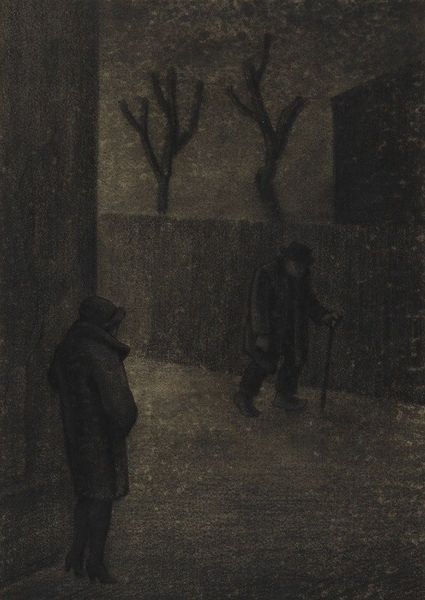 Curator: This is Vincent van Gogh's "Old Street The Paddemoes," created in 1882. It's a pen and ink drawing, currently residing at the Kröller-Müller Museum. What are your first impressions? Editor: Bleak. It feels intensely bleak. The sketchiness of the lines, the dark tones... it evokes a real sense of isolation, almost a haunting quality, don't you think? Curator: Absolutely. The image embodies the hardships of the working class in The Hague at the time. Van Gogh was deeply invested in representing their reality. The materiality, specifically the inexpensive pen and ink on paper, speaks to the economic constraints both he and his subjects were under. Editor: And consider the institution displaying this work now. How has the perception of the common subject changed, elevated, by its display within the museum context? Van Gogh aimed to give these people a voice, and now that voice echoes through gallery walls. The politics of representation are central here. Curator: Precisely. Think about his choices here - the swift, almost frenzied strokes that make up the architecture, and especially the figures walking down the road. This piece precedes his adoption of vibrant colour, the quick and cheap production means speak to this reality. We can see how Van Gogh attempts to communicate with basic materials the struggles around him. Editor: Also, how has Van Gogh's reputation shaped how we see this sketch? Had it been anyone else, might we have simply dismissed it as a preparatory exercise, rather than viewing it as a powerful piece of social commentary displayed in the prestigious walls of the Kroller-Muller? Curator: The institutional frame indeed. Ultimately it’s interesting to think about how the labor, in this case Van Gogh's rendering and inking, combined with a social consciousness produces the cultural artifact we are looking at here. Editor: This piece encourages us to question who has the power to shape artistic taste, which artistic subjects find space, and who's narrative, as represented in museums like this, gains cultural prominence. Curator: Absolutely. There's something raw and honest in this early work, and it raises fascinating questions about art, labor, and the portrayal of poverty. Editor: Indeed. A poignant and complex snapshot of a moment in history and of art world accessibility.