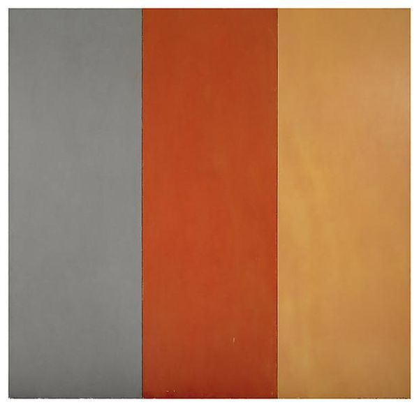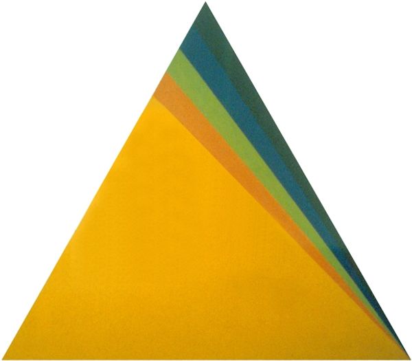 Jeremy Moon created this untitled painting, commonly referred to as 'Cape Red', using paint on canvas. The immediate impression is one of geometric simplicity. A large, centrally positioned red square dominates the canvas, oriented as a diamond. At each corner, a quarter-circle of contrasting color—black, blue, green and yellow—punctuate the red field. The color relationships create visual interest and a sense of balance. Moon’s emphasis on shape, color and composition reflects the formalist concerns prevalent in post-war abstraction. The artwork appears to have a flattened perspective, which reduces any illusion of depth. This challenges traditional painting conventions and emphasizes the physical qualities of the canvas as an object. The structural arrangement encourages us to consider how the basic elements interact and create meaning, and how the painting destabilizes any straightforward interpretation, prompting ongoing visual and intellectual engagement.