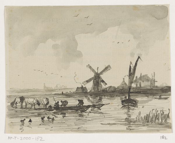 Johannes Tavenraat’s "Waterlandschap met molen," currently held at the Rijksmuseum, is a drawing executed with delicate lines in pen. The composition centers around a serene waterscape, where a windmill and figures in boats create a harmonious balance. The light grey wash evokes a sense of tranquility, inviting quiet contemplation. Tavenraat masterfully employs line and form to construct depth and texture. Note how the vertical strokes used to depict the reeds contrast with the horizontal lines delineating the water's surface, creating a sense of spatial recession. The windmill, rendered with precise detail, anchors the composition, while the figures in the boats add a human element to the scene. This artwork challenges conventional landscape portrayals through its structural simplicity, offering a contemplative view. The absence of vibrant colors directs our attention to the tonal variations of the wash, inviting us to ponder the relationship between form and perception. This quiet scene captures the essence of Dutch landscape art while prompting us to reflect on our place within the natural world.
