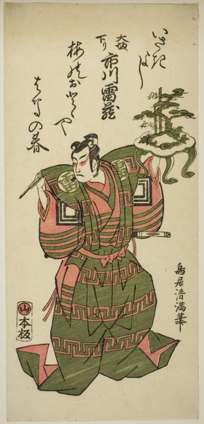 Editor: This woodblock print, "Arashi Otohachi I as a Famous Comedian," made sometime between 1756 and 1776 by Kitao Shigemasa, presents a striking figure. He looks very proper but something seems melancholic, maybe in the set of his brow. What do you read in this portrait? Curator: Melancholy is a very perceptive observation. Ukiyo-e prints, like this one, often captured the floating world of Edo-period Japan—the theaters, pleasure districts, and the personalities that thrived within them. While seemingly celebratory, there's often a bittersweet undercurrent. This comedian, Otohachi, seems to be caught between performance and introspection. Do you notice how the bright colours and elaborate patterns contrast with his rather somber expression? Editor: Yes, now that you mention it, there’s a real tension there! The vibrant umbrella and clothing are almost at odds with the man's slightly downturned gaze. What do you think the artist was trying to convey with that juxtaposition? Curator: Perhaps Shigemasa was playing with the ephemeral nature of fame and entertainment. A comedian's job is to bring joy, but behind the mask, there may be a more complex reality. I find myself wondering about Otohachi's own story and the pressures he might have faced. It is this glimpse beyond the public persona that makes Ukiyo-e so compelling, wouldn't you agree? Editor: I totally agree! It makes me think about celebrity culture today and the difference between image and reality. I initially saw a simple portrait but it's clear that it's so much more. Thanks! Curator: Exactly. Art can reveal more than we originally realize.