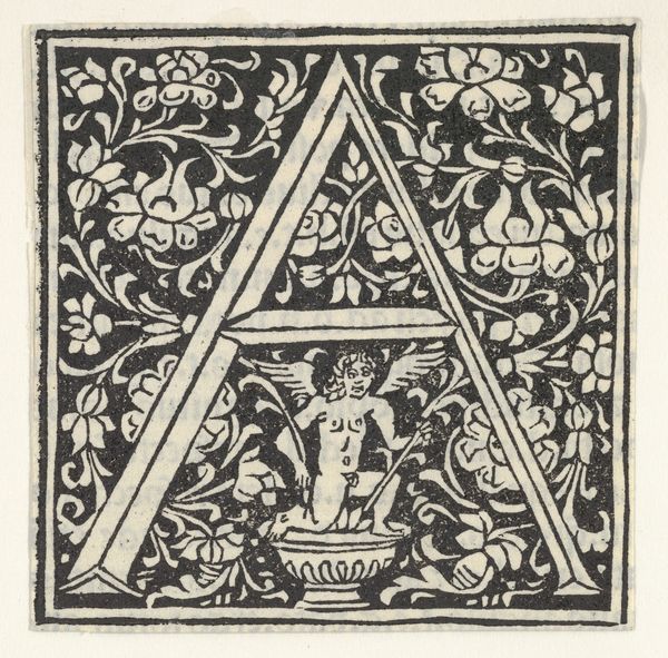 Editor: Here we have Heinrich Vogtherr the Elder’s “Initial letter A with putto,” a print from between 1533 and 1540. The use of stark black and white is quite striking, and the letter A seems to be hiding something within it. What do you see in this piece, particularly in the context of the Renaissance? Curator: Ah, yes. Notice how the putto, a symbol of innocence and divine love, is literally enveloped by the letter "A." In Renaissance imagery, this juxtaposition speaks volumes. The "A" itself isn't merely a letter; it's a container of meaning, holding within it this youthful figure associated with virtue. It suggests the power of beginnings and perhaps the potential held within language itself. The grape vines point to both Eucharist, the sacred offering in Christian tradition, and to earthly pleasures. What connections can you make? Editor: So, it's almost as if the letter A is both a beginning and a symbolic boundary, containing the putto's potential within its form. Curator: Precisely! The artist’s decision to use black and white intensifies the symbolic weight. The sharp contrast reinforces the tension between the innocence represented by the putto and the imposing structure of the letter, which may symbolize worldly structures or knowledge itself. Consider how the heavy lines of the woodcut add to the sense of both definition and constraint. Do you see that interplay now? Editor: I do. So, it is almost like the artist is contemplating the complexities of innocence, knowledge, and faith in the Renaissance period. This puts a different perspective on letter design. Curator: Indeed. By visually encoding layers of meaning within a seemingly simple initial, Vogtherr invites us to decode not just the image, but the values of his time. Visual forms communicate meaning as clearly as the written word. What a beautiful visual puzzle!