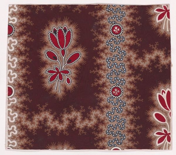 This anonymous textile design at the Met presents undulating garlands of stylized flowers and leaves separated by zig-zagging strips of pearls. The work is an exercise in the interplay between organic forms and geometric patterns. The dominant visual experience is one of rhythmic repetition, where the stylized floral motifs, rendered in earth tones and punctuated by small colored accents, create a delicate balance against the regimented lines of pearl-like dots. The composition is structured around the juxtaposition of the natural and the artificial. The flowers, while organic in subject matter, are highly stylized and reduced to basic shapes, each petal articulated by uniform dots. This approach reflects a tension between representation and abstraction, where the essence of the floral form is captured through minimal geometric means. This push and pull between the organic and the geometric destabilizes traditional notions of natural beauty, suggesting a world where nature is mediated and reinterpreted through formal structures. The pearls, precisely aligned, act as a counterpoint to the meandering floral arrangements, reinforcing this tension and prompting a deeper reflection on how we perceive and categorize the world around us.