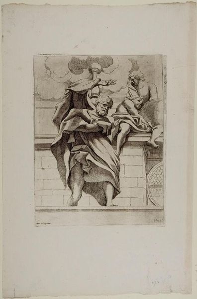 Curator: This print, housed here at the Harvard Art Museums, is entitled "Christ and the Apostles" by Ferdinand Ruscheweyh. Editor: The first thing that strikes me is the resolute tranquility, despite the somewhat stark presentation. Curator: Ruscheweyh's choice to depict Christ holding the vexillum, the banner of victory, is a potent symbol. It resonates with the cultural memory of triumph over death. Editor: Yes, and how that symbol served as a critical image of imperial power adopted into the church is fascinating, considering the context of religious art and its relationship to political authority. Curator: Exactly, and the halo isn't just about holiness, but also about signaling divine authority. It speaks to a visual language understood across time and cultures. Editor: Thinking about it now, the composition clearly underscores the intertwined roles of the church and state in the construction of Western identity. Curator: It's a dialogue, really, between the spiritual and the temporal, captured in ink. Editor: Precisely, this image brings into focus the complex interplay between religion, politics, and cultural memory.