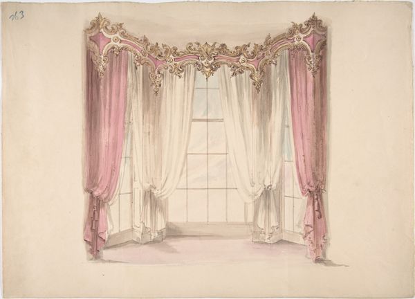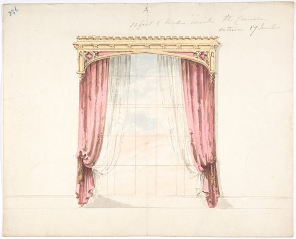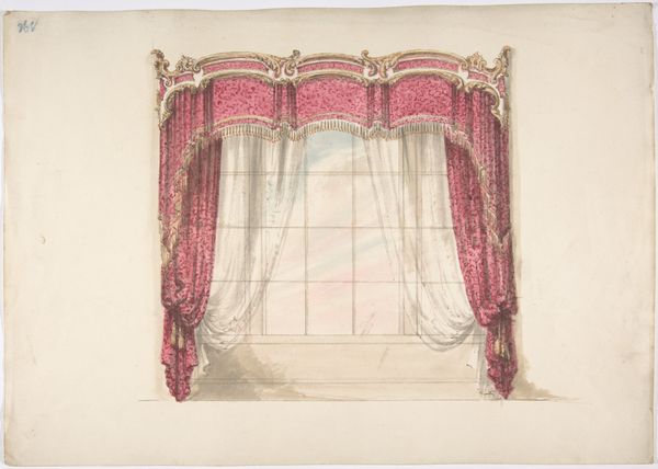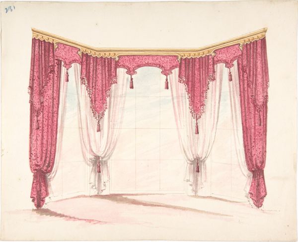 Editor: So this is "Design for Red Curtains with Red Fringes and a Gold Pediment," dating from 1800 to 1850, medium is watercolour and print. It strikes me as such a lavish depiction, very focused on upper class aesthetics and the control of domestic spaces. How might we interpret that in its historical moment? Curator: Well, consider the moment: the rise of industrial capitalism, the consolidation of wealth, and how domestic spaces become performative stages for class identity. This isn't just about curtains; it's about visibly demonstrating status. Who benefits from these displays, and who is excluded? Editor: So, you’re saying the drawing serves as propaganda, normalizing wealth disparity? Curator: Precisely. Think about the labour required to create and maintain such ostentation and how this labor is often invisible. Consider the gendered aspect, too – domestic spaces are managed by women but dictated by the men of that era. What narratives are being constructed and enforced by this design? Editor: It's also interesting how this drawing gives directions, or rather reinforces these hierarchical designs and aesthetics to domestic craftsmen, and others aspiring to decorate in this style, to mimic or create in their designs. It definitely seems to have that ripple effect. Curator: Exactly! Consider the ripple effect—how such designs seep into the cultural consciousness, perpetuating certain standards. It is very much linked to the exercise of soft power. It provokes us to ask if art reflects life or reinforces structural oppression. Editor: This definitely opens my eyes to the socio-political impact design and art can make in any period. It certainly prompts further questioning. Curator: Indeed, it transforms something seemingly innocuous into a space for critical awareness.