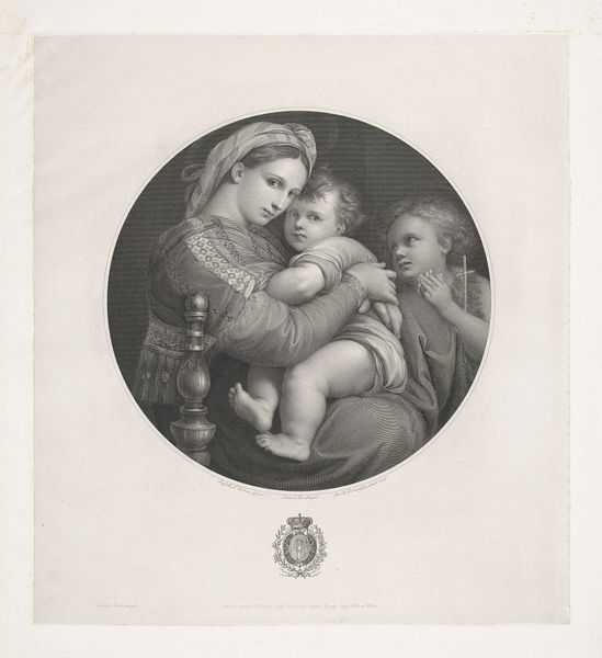 Carel Frederik Curtenius Bentinck created this print, "Mother with Two Children," using the technique of steel engraving. Steel engraving, popular in the 19th century, was prized for its capacity to reproduce fine detail and large editions. The process involved a highly skilled engraver meticulously incising an image into a polished steel plate. The hardness of steel allowed for intricate designs and a longer lifespan of the plate, permitting more prints to be made without significant wear. Consider the labor involved: from the production of the steel plate itself to the artistry of the engraver, each print represents a significant investment of time and expertise. The contrast with the apparent ease of mass production made possible by this technique is striking. Ultimately, understanding the material and process behind this print invites us to consider the complex relationship between art, labor, and the burgeoning industrial age. It challenges the notion of the artwork as solely the product of individual genius.