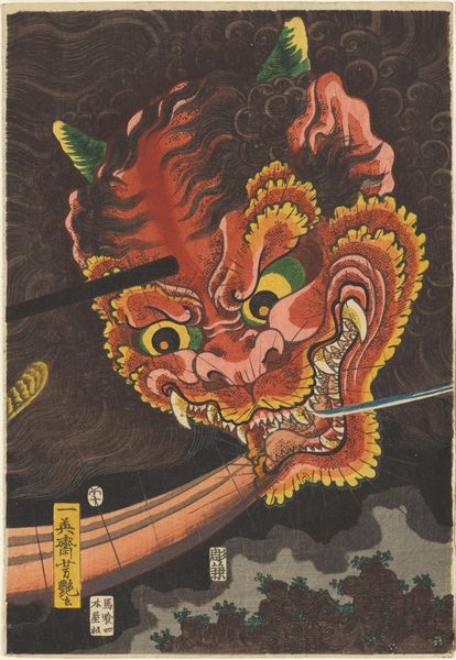 Editor: This triptych by Utagawa Yoshitsuya, titled Shuten dÅji at Åeyama, depicts a very dramatic scene. The colors are intense, and the central demon face is quite imposing. What can you tell me about this work? Curator: Well, isn't it a marvel? Yoshitsuya really knew how to ramp up the drama. Beyond the visual spectacle, consider this—it's a clash of worlds, isn't it? Order versus chaos, man versus monster. It evokes a stage play, almost like the artist wants us to wonder, 'Who are the real monsters here?' Editor: That's a really interesting perspective. I was so focused on the surface level of the image, but now I see the deeper conflict. Curator: Exactly! It reminds us that art often asks questions, it rarely provides easy answers. Keeps us on our toes, doesn’t it? Editor: Definitely something to think about. Thanks for opening my eyes to that. Curator: My pleasure! It's these little sparks of insight that make art so endlessly fascinating.