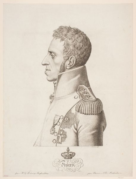 Editor: Here we have Vilhelm Kyhn's lithograph of Frederik VI, made sometime between 1821 and 1838. It's currently held at the SMK. It’s fascinating how the artist was able to create such detail using lithography. What is particularly interesting to you about it? Curator: It’s a fascinating example of how lithography democratized portraiture. Prior to this, portraits of the elite were largely the domain of painting, accessible only to the wealthy. The means of production matter here. Lithography allowed for relatively inexpensive reproduction and distribution, making images of the King, like this one, accessible to a broader audience. Editor: So you're saying the technique used changed who could see and consume art? Curator: Precisely. Think about the stone itself. It’s not inherently valuable like gold or ivory, but the labor invested in preparing the stone, creating the image, and printing—that is where value is generated. Kyhn's technical skill is also on display here; consider how the material qualities, ink on paper, create an image of authority. How does the contrast and detail function, not just aesthetically, but also ideologically? Editor: I hadn’t considered how the material accessibility connects with the depiction of power. Were these prints widely circulated? Curator: That’s the key question. Were they used as propaganda? Were they sold to generate revenue? Investigating the print runs and distribution networks would reveal a lot about the relationship between the monarchy and its subjects at this time. We can also discuss how printmaking has a tradition rooted in craftsmanship and consider the social class of this process compared to painting. Editor: That's fascinating. I hadn't thought about the socioeconomic implications of lithography and printmaking. Thanks for the insight. Curator: Likewise! It's helpful to be reminded how closely technique, labor, and consumption intersect.