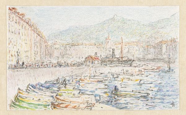 Curator: Looking at this watercolour and coloured pencil drawing from 1883, "Grenoble" by Johan Barthold Jongkind, I am immediately struck by its contemplative, almost wistful atmosphere. Editor: Yes, a calmness radiates, yet it's also a very quickly rendered scene, perhaps on site. The thin washes and pencil work show the artist working economically. One can see the textured laid paper coming through. It reminds me of the rise of commercially-made sketching blocks and art supplies for leisure, how a landscape like this one could be quickly captured as a memory by middle-class consumers. Curator: That’s fascinating! And the scene Jongkind is depicting features certain visual anchors that consistently appear in landscape art to evoke particular emotions. The river symbolizes the passage of time. Notice how it flows towards the distance. The bridge, an emblem of connection... perhaps signifying the link between man and nature. And then there's the distant mountain, so often representative of endurance, and permanence. Editor: Good point. I think seeing how this sketch was likely made—en plein air, or “in open air”—helps connect to its symbolism as well. Jongkind was probably part of a burgeoning art market that fueled the accessibility of painting nature—and what it stood for—through accessible tools and quick methods like sketching. His role is both documentarian and symbol-maker through material choice. Curator: Absolutely! The fleeting nature of the impressionistic style perfectly captures the fleeting quality of a moment, doesn't it? The colors themselves reinforce this idea – soft blues, gentle browns, evoking a sense of serenity and perhaps even melancholy. I detect a hint of nostalgia, looking back at a peaceful landscape untouched by the growing industrialisation of the time. Editor: Perhaps even manufactured nostalgia, packaged and primed for purchase as an aesthetic ideal and portable good. What strikes me looking again is how much raw paper remains visible. It's unfinished but so artful in that openness! That glimpse into the artist’s labor really draws the eye toward the art-making process itself as part of the artwork's symbolic message. Curator: A fascinating contrast there between a read of the scene's iconography and the actual facture of the work, each interpretation deepening our insight into Jongkind's Grenoble. Editor: Precisely. A potent convergence of representation and material fact.