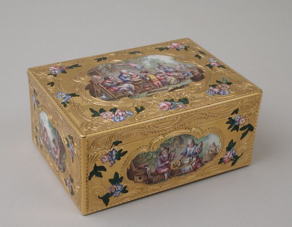 Curator: Look at this beautiful "Inkstand," crafted by Manufacture nationale de Sèvres in the late 18th or early 19th century. You can find it here at the Art Institute of Chicago. Editor: Oh, it’s striking. Immediately, I see the high rococo style. It’s opulent in its truest essence, wouldn’t you agree? Curator: Absolutely. Now, focus on the interplay of porcelain and ceramic. What does that melding suggest to you? Editor: It tells me about labor. How the creation of this object, probably displayed as art, came down to the labor of extracting those raw materials, the porcelain in the mountains and clay on the banks of rivers and transporting and preparing them through human force. The firing, the casting, the glazing... it’s immense. I wonder how much time an object like this represented back then in wages? Curator: Indeed! I am interested in these flower decorations, are they supposed to depict nature truthfully, or are they an idealization? What message is conveyed? Are we romanticizing something? Editor: It reflects the tension in the decorative arts of the period: between faithful naturalism and stylized artifice. And that vivid turquoise bordering those panels... what’s your read on it? It gives it this extra brightness, like a gemstone. Curator: Precisely. It captures the aesthetic that was prominent in European high society. An expression of wealth. And the level of handcrafted skill... the gilding... the fineness of the porcelain. Each component had many makers in that time. Editor: True! You touched on its craftsmanship. Considering that it's an inkstand... I'm thinking of the physical labor of writing. So many quills needing regular sharpening. And how this stand symbolizes intellectual and political labor in its own way. Curator: Thinking of its use within a study, it does act almost like a crown on all of that endeavor... the literal seat for the generation of new ideas and directives that reshaped their time, doesn't it? Editor: Definitely a throne for the creative, rebellious, or even the ordinary bureaucrat's messy genius! Makes one think differently about "high art" and its connection to the "lowly" act of daily writing, right? Curator: Precisely. That tension is what makes it continue to fascinate! Editor: Well said! It gives new appreciation for what can be considered art.
