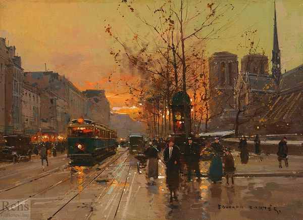 Curator: Before us hangs "Triumphal Arch," a painting credited to Edouard Cortes, capturing an urban scene with the Arc de Triomphe as its majestic backdrop. Editor: Immediately, I get a sense of melancholy romance. It's the kind of scene that whispers of forgotten stories and fleeting encounters on wet cobblestones. Very impressionistic! Curator: Indeed, there's a strong Impressionistic current. Note how the wet street reflects the street lamps and the subtle atmospheric perspective employed to capture the depth of the cityscape. Think of it as a record of urban life distilled to its emotional essence, a romantic perspective of a bustling place. The Arch is not simply stone, but an echo of the power it projects to that bustling scenery below it. Editor: Exactly! The glow of the street lamps seems to imbue the people walking the streets below with a certain warmth. It softens the architecture in an almost dreamlike way and definitely pulls you into its reality. It has a sort of wistful, yearning feeling. Curator: That's the crux of it, isn't it? The arch itself stands as a powerful symbol, the enduring monument to triumph, in contrast to the daily existence of the ordinary, somewhat anonymously portrayed people scurrying along the boulevard beneath its looming promise. What might they dream of or carry home in memory from that passing, illuminated instant in time? Editor: And yet, isn't it comforting? To find grandeur in the everyday hustle, like discovering a tiny perfect bloom in the middle of the city. Cortes managed to show that a memory in and of itself can echo an accomplishment for generations to admire. Curator: Beautifully said. Cortes has taken an icon of power and rendered it approachable, softened by time and the intimacy of everyday life. Editor: A little magic for the mundane. A moment caught that still whispers. I’d say it has given me a great insight that perhaps triumph is merely perspective.