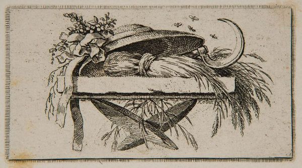 Curator: Here we have “Piece VII,” an anonymous work held in the Harvard Art Museums. Editor: It has a certain handmade charm. The black ink on the tan paper gives it a rustic, folk-art quality. Curator: Indeed, its production and reception are fascinating. Likely a woodcut, it hints at the labor involved in repetitive, decorative processes common in early printed materials. Editor: The basket of flowers motif is certainly common, but the linework feels less refined, more utilitarian. Perhaps it’s a unique craftsperson’s adaptation of a popular symbol. Curator: Exactly. It's interesting to consider its role within broader visual culture. Was it for religious texts, advertisements, or personal embellishments? Editor: The imperfections add authenticity, a reminder of the artist's hand in creating something intended for wider consumption. Curator: It speaks volumes about the democratizing potential of printmaking and its impact on visual language. Editor: It certainly allows us to imagine the hands that made and used it in the pre-digital age.