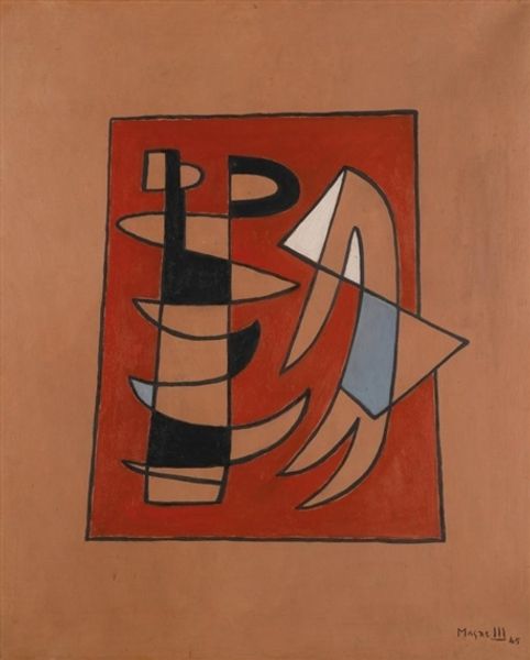 Curator: This is Juan Gris’s “Bowl and Book,” painted in 1927. Editor: Well, isn't that...intriguing. A collection of flattened shapes, like someone exploded still life and tried to put it back together with magnets. I immediately notice a stark juxtaposition of earthy tones against sharp geometry; it feels intentionally disjointed. Curator: Absolutely, Gris employs a very late Cubist style here, nearly flirting with total abstraction. It's oil on canvas and incorporates a "paste up" element too, a paper collage layered into the painted surface. See how the fragments suggest these ordinary objects: a book, a bowl and pipe but refuse to be fully defined. It’s very of its time, you know, moving away from representation and toward... Editor: The raw materials become their own subject, revealing an interest in challenging how art is both constructed and perceived? Almost dismantling traditional easel painting? Curator: Precisely! And yet, amidst that, there is a quiet intimacy. I find that tension so compelling – the artist reaching out to something ethereal through geometric forms, while also being so anchored in the quotidian, in humble items found within one’s studio. The stark black is grounding the composition too. It’s like gazing into a well of contemplation, the negative space really emphasizes that! Editor: True! Looking closer, it really is this almost ascetic assembly. Labor, arrangement, and intention are key—the artistic value emerges less from the representation and more from this deconstruction-construction process, isn't it? What kind of social conditions allowed that experimentation is something I'd really like to unpack... Curator: Ultimately, "Bowl and Book" offers such a compelling tension, it sits between this realm of abstraction and figuration, an exploration of both perception and artistic intention. Editor: Yes, there's more than meets the eye here in considering Gris' radical play. From a deconstructed still life that whispers of the social forces transforming both art and society itself!