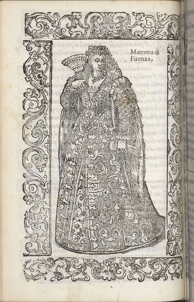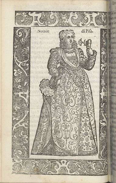 Curator: Today we're looking at a print entitled "Donna di Romagna" by Christoph Krieger, dating back to 1598. It depicts a woman, presumably from the Romagna region, in elaborate dress. Editor: What strikes me immediately is the intense detail in the clothing, juxtaposed with the flatness of the figure. It's a dizzying display of pattern and texture created simply with lines etched in ink. How was such an effect achieved so uniformly across this textile representation? Curator: These kinds of prints, especially during the late Renaissance, served multiple purposes. Certainly, they were artistic products, but they also acted as documents of social status. Clothing denoted one’s place within the hierarchy. What’s truly telling is that dissemination was made easier, meaning the latest fashions and representations of power could be propagated further than ever before. Editor: It's all about the labour involved, isn't it? Consider the production of the actual fabric the woman might have worn. It most likely came from an Italian textile workshop, designed, woven, and embroidered by many artisans, then emulated here through a different mode of skilled reproduction, an engraver replicating a representation through this very print. And ink! Its trade, origins... such an unassuming substance but it's what allows this image to be made and re-made. Curator: Absolutely. And this print likely circulated among the elite, reinforcing the ideals and aspirations of the time. It visualises power. The attire broadcasts prestige, becoming a model, even a tool. The history of fashion in art always brings fascinating class-related context to the fore, especially when that fashion is shown to be the signifier of success itself. Editor: You're right. This wasn't just 'craft'; it played a vital socio-political role. Every line tells of skilled craftsmanship and artistic application but what of the materials, where do they come from, what do they become through production in the workshops of the late 16th Century, what traces do they leave? Curator: In that respect, looking beyond pure aesthetics, it tells us about so much beyond the woman it claims to represent. Editor: Yes, precisely, beyond face value: material considerations, material transformation and an expression of labour.