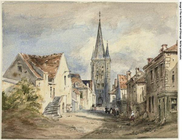 Adrianus Eversen created this watercolor artwork, titled "Gezicht te Hattem," during the 19th century. The scene is immediately striking in its composition, where Eversen frames a quaint, somewhat dilapidated town square with a prominent church tower on the left balancing the crumbling facades of old buildings on the right. The muted palette of grays, browns, and soft reds enhances the somber mood, reflective of the unadorned lives of the townsfolk depicted in the foreground. Eversen's meticulous attention to the architectural details and textures of the buildings invites a deeper structural analysis. The buildings are not merely represented, but are presented as historical signs carrying stories of wear and permanence. This approach resonates with semiotic theories, where the town itself functions as a text, revealing layers of cultural and temporal significance. Note how Eversen uses the architectural forms to articulate a dialogue between decline and perseverance, mirroring perhaps, broader cultural anxieties of the time. This delicate balance between decay and endurance remains a key theme, offering a contemplative view of history embedded within the everyday.