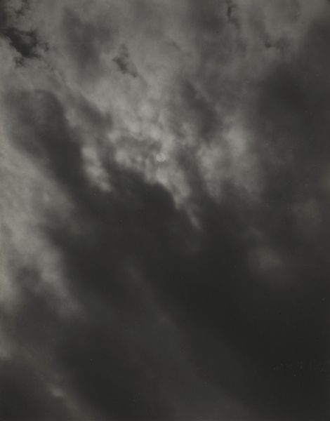 Editor: Here we have Alfred Stieglitz's gelatin-silver print, "Songs of the Sky XX5," made sometime between 1923 and 1929. It's a dramatic image; the stark contrast between the dark clouds and the luminous patch of sky really grabs you. What do you make of the composition? Curator: The photograph’s power resides significantly in its tonal arrangement and formal resolution. Note the stark contrast: the density of the blacks against the ethereal grays and whites. Stieglitz uses this to flatten the pictorial space, pushing the representational elements toward abstraction. The composition seems less about capturing a realistic skyscape and more about exploring light, shadow, and texture as compositional tools. What purpose could this departure serve? Editor: Well, the texture of the clouds does seem really important here. It's almost like he's sculpting with light, defining shapes and depth solely through gradations of tone. Curator: Precisely. He directs our focus not on narrative or representation but towards the inherent visual properties of the medium itself. One might consider the structural relationships. How do the various shapes of cloud interact, what rhythmic qualities do you observe, and how do these relationships establish visual coherence within the frame? Editor: Now I see it – the shapes almost mirror each other, the way the darker clouds curve around the lighter area in the middle creates a kind of visual echo. It feels balanced, yet dynamic at the same time. Curator: Precisely. Stieglitz presents photography as capable of nuanced expression akin to painting. The photograph transcends being a mere record. The photograph's meaning derives solely from its visual elements rather than depending upon external narratives. Editor: This makes me appreciate how modern the photograph feels. It’s not just a picture of clouds, it’s an investigation into the properties of photography itself. Curator: Indeed, we can recognize Stieglitz inviting viewers to consider the work's intrinsic values, its composition and textural variations, independent of its referentiality to reality.