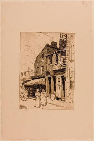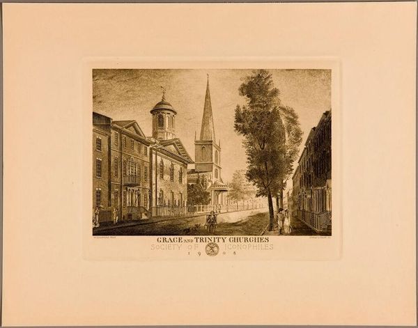 Curator: This etching by Sidney L. Smith is titled "Wall Street in 1883." Editor: Oh, it feels so…orderly. The rigid architecture, the receding perspective. Is that meant to suggest progress, or perhaps a lack of imagination? Curator: Smith’s print captures a moment of rapid transformation. Think about the opulence of the architecture versus the reality of labor happening just out of view. Editor: Absolutely. Those classical columns juxtaposed with the grime and bustle of the street highlight class divides, the very structures reinforcing inequality. Curator: It's as if the artist is saying, “Here it is, the American dream in architectural form, but who gets to live in it?” Editor: And who pays for it, both in labor and at what cost? This makes me reconsider what “progress” really means. Curator: Indeed. It makes you wonder about all the forgotten stories that built those structures. Editor: Definitely. A perfect reminder that history isn't just about grand narratives, but also the untold experiences beneath.