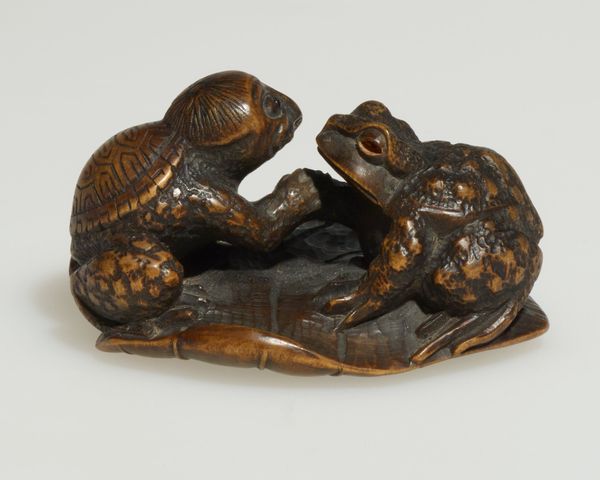 Curator: Oh, this one always gets a reaction. The artist, Pierre-Jules Mêne, created "A Fox Holding a Dead Rooster" sometime in the 19th century. It's a bronze sculpture, and quite a striking piece. Editor: Definitely striking. It's… well, it's brutal, isn't it? The fox looks almost smug. And the rooster—poor thing looks completely defeated. I sense a victor-vanquished power dynamic which makes me uncomfortable. Curator: Mêne was known for his animal sculptures. There was this fascination with the natural world at the time, and capturing animals in bronze became quite popular, almost fashionable. He's immortalizing a specific, arguably cruel moment from nature’s playbook. It's less sentimental and more observational. Editor: Observational, yes, but observe how carefully it is staged. How is this "natural"? That rooster's wings are so delicately placed—almost artful in their stillness. Do you think Mêne is highlighting a class struggle maybe? Or rural versus urban power? Curator: Possibly. Romanticism and Realism often blended during this period. There's the romanticized view of nature, sure, but Mêne also depicts the harsh realities of survival. It’s about the food chain, who has power and who doesn’t. He’s also presenting an inherent relationship between death and nourishment in the circle of life. Editor: But making it "art" changes it, right? The bronze gives it weight, literally and figuratively. The small details of the fur, the feathers are immortalized. I find myself questioning if this is just documenting or if it serves to legitimize predation. Curator: Art often invites such questions. The texture of the bronze lends a sort of permanence, so this struggle feels timeless. Editor: Perhaps the value isn't in what the work seems to obviously portray, but that it can stir those very dialogues. That it captures us and allows the opportunity to ask important ethical and cultural questions about life. Curator: Precisely. That's why Mêne’s fox continues to provoke thought. He has offered the tools—you construct the conclusion.