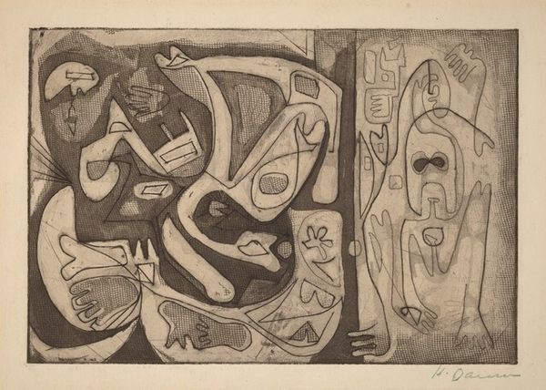 Norman Gorbaty made this print called 'The Three Kings' using etching, a process of drawing into a metal plate. It's so interesting how he builds up his images with these scratchy, expressive lines! The overall tone is dark, but within that, there’s a lot of variation. Look at the dense crosshatching that creates areas of deep shadow, contrasted with the lighter, sketchier lines that define the figures. It feels kind of frenetic, like he’s digging into the metal with real energy. The faces of the kings feel both monumental and vulnerable, like ancient masks carved with shaky hands. There’s a real tension between representation and abstraction; you can kind of see the faces, but they're also broken up by lines and patterns. Gorbaty reminds me of someone like Dubuffet, who was also interested in raw, expressive mark-making. But really, the beauty of a piece like this is that it doesn't give you all the answers; it invites you to bring your own interpretations and make your own connections.