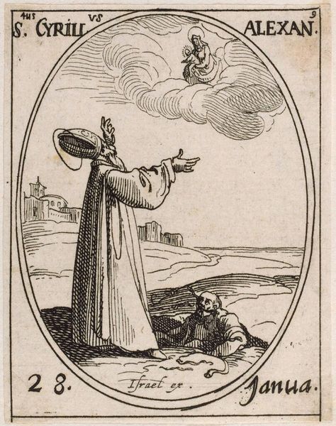 Editor: This is Jacques Callot's "Saints Tiburtius and Valerianus," a tiny print, barely three inches tall. It seems to capture a moment of divine intervention, but the details are so intricate! What draws your eye when you look at this work? Curator: Well, its miniature size belies the grand drama Callot manages to convey. Notice how the angel descends, bearing a crown – a symbol of martyrdom. It’s as if a whole story is unfolding in a single, carefully etched frame. Are you sensing a story here? Editor: Yes! The angel contrasts with the figures on the left. They seem to be doing something, maybe torturing someone? Curator: Indeed! Torture and divinity. Callot’s technical virtuosity allowed him to suggest so much with so little. The power of faith, the cruelty of man, all within this delicate oval. What a profound reminder that even the smallest things can hold immense meaning.