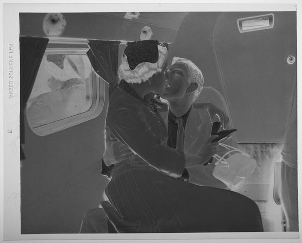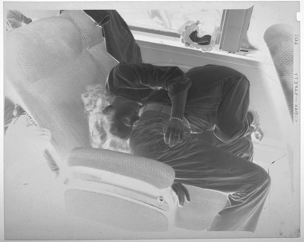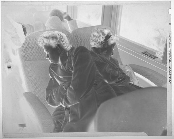 Editor: This is an untitled photograph by Jack Gould, showing a woman and children sleeping on train seats. It’s very intimate, almost voyeuristic. What do you see in this piece? Curator: It's dreamy, isn't it? Like a memory half-formed. The negative space lends it a ghostly quality, as if the subjects are fading back into the train's fabric. I wonder, is it about the journey, or the vulnerability of rest in transit? Editor: That's beautiful - I hadn't thought about vulnerability. Curator: Sometimes art whispers, sometimes it shouts. This one murmurs secrets of travel and family. Editor: I’ll certainly remember that. Thanks!