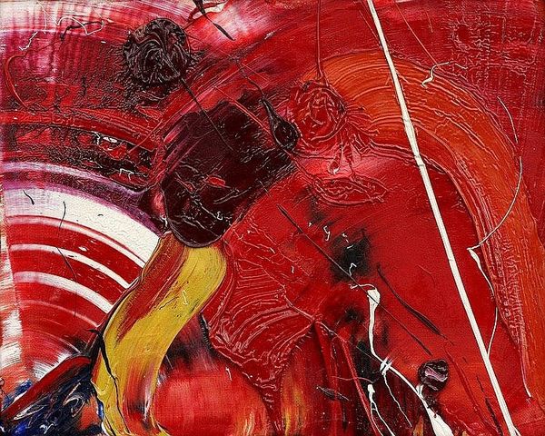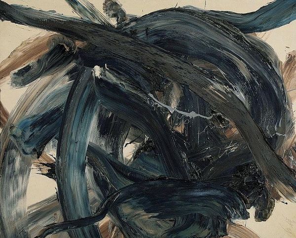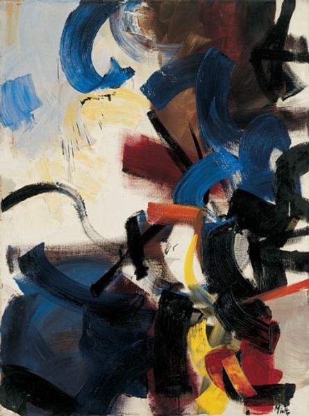 Curator: We're looking at Kazuo Shiraga’s “Tenkosei Kaosho,” created in 1962. It's an oil painting very much in the Gutai spirit. What are your initial thoughts? Editor: Raw energy, primarily. A visceral explosion rendered in deep reds and blacks. There’s a frantic quality to it. The color seems both aggressive and… primordial. Curator: Yes, aggressive. Shiraga was part of the Gutai group, a radical postwar movement in Japan that challenged traditional artmaking. They valued action, gesture, and the materiality of paint itself. Shiraga, famously, would often paint with his feet, suspending himself over the canvas. Editor: Knowing that context deepens the sensation of violence. It’s no longer just about the symbolic value of the colours. The red can be linked with fire, passion, and vitality. I also notice the linear slashes, white and grey, moving dynamically around. Were these parts created with bare feet too? Curator: Likely. This wasn't about refined brushwork. It was about direct physical engagement, almost a ritualistic dance with the materials. Gutai artists sought to break down the barrier between artist, material, and artwork. It shows a fascinating dialogue between Abstract Expressionism and pre-modern art movements. Editor: Ritualistic… that word resonates. The image evokes creation myths—chaos before order. And yet, within this apparent disorder, a rhythm and a strange harmony emerge, maybe due to how its gesture interacts with other forms, almost fighting against each other, perhaps against the background. The chaotic brushstrokes bring together cultural symbols with basic, primordial gestures and patterns. Curator: Precisely. This piece demonstrates how labor, performance, and the properties of the medium come together to create something more than just an image. It is about an immediate gesture of paint over a flat material with great intentionality and meaning Editor: "Tenkosei Kaosho". When we recognize those symbolic depths, those cultural links embedded even in pure abstraction, a work like this ceases to be just aesthetic. Curator: It becomes a record of a performative act. And an incredible example of mid-century avant-garde exploration into materiality and action. Editor: Absolutely, a captivating dance between form, color, and the raw energy of creation, as well as tradition and modernity, as brought together in Japanese identity.