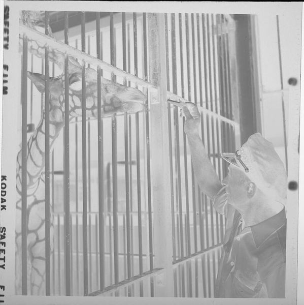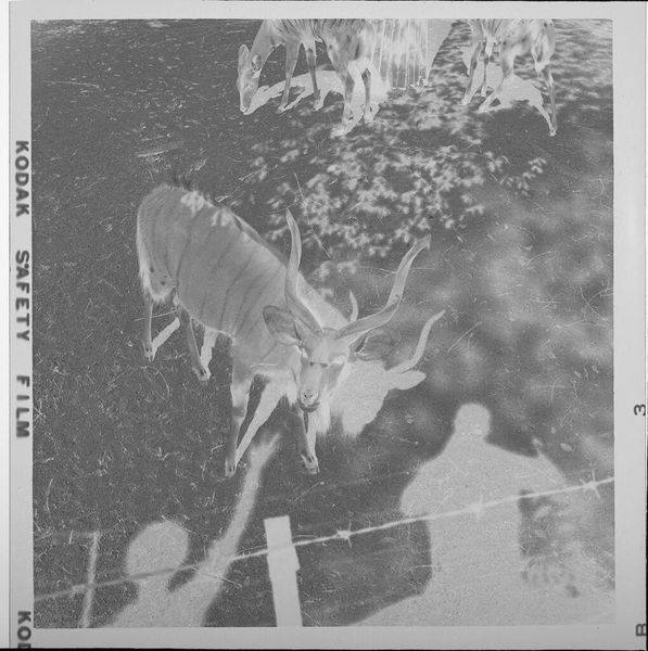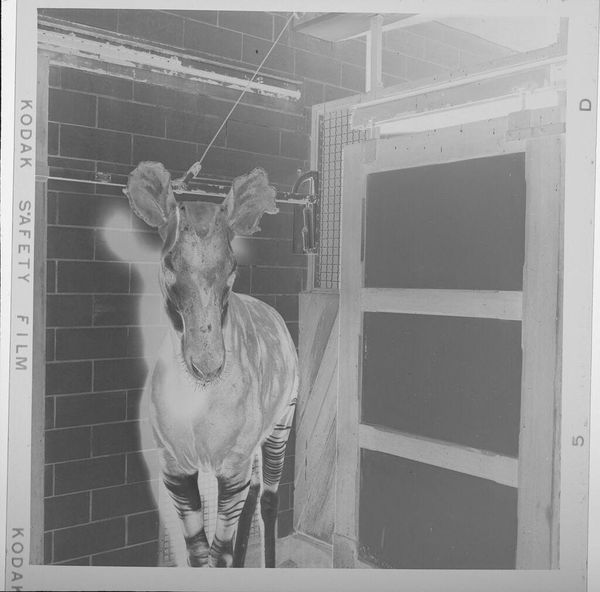 Editor: This is an untitled gelatin silver print by Jack Gould, depicting antelopes at the zoo. It has a candid, documentary feel. What stands out to you? Curator: Notice the sharp horns. They evoke ancient symbols of power and virility, echoing images found in cave paintings and early mythologies. Consider how these animals, now confined, still retain that primal association. Editor: So, the image plays with the contrast between freedom and captivity? Curator: Precisely. The zoo setting becomes a stage where these potent symbols are displayed, almost neutralized, yet still hinting at something wilder within. What do you make of their interaction? Editor: It feels almost ritualistic. I hadn't thought about those deeper connections.