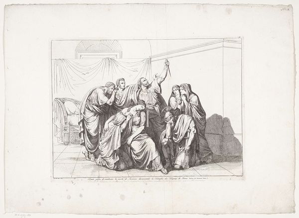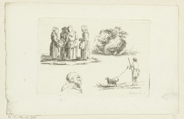 Jean Jacques de Boissieu made this print using etching, a process in which a metal plate is coated with a waxy, acid-resistant substance called a 'ground'. The artist then scratches an image into the ground, exposing the metal. When the plate is immersed in acid, the exposed lines are eaten away, creating grooves. These grooves hold ink, which is then transferred to paper to create the print. In "Compositie met twee mannen bij een ton en een gezeten jongeman op de rug gezien", the etched lines give a sense of spontaneity, as if rapidly sketched from life. But don't be fooled: etching is actually a very deliberate process. The artist has to plan out the image in advance, and carefully control the amount of time the plate spends in the acid bath. The print speaks to the wider social context through its depiction of everyday life. It's a reminder that art doesn't have to be grand or monumental to be meaningful. Sometimes, the most profound statements are made through simple observations of the world around us.