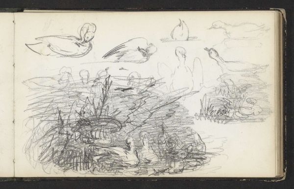 This is a sketch by Johannes Tavenraat, "Ducks on the Water and Reed Stems", created with pen in gray. The scene captures a tranquil waterside setting, rendered with delicate strokes and washes of ink that lend the piece a fluid, ephemeral quality. Notice how the composition is structured around horizontal bands of water, populated by resting ducks. Tavenraat uses variations in tone and texture to differentiate the ducks, some appearing solid and well-defined while others are mere suggestions, blending seamlessly with their reflections. The reed stems introduce a vertical counterpoint, their delicate lines creating a sense of depth and framing the scene. What’s striking is the artist’s economical use of line, each stroke seemingly imbued with intention. The overall effect is one of understated elegance, in which the artwork invites us to contemplate the subtle beauty of the natural world through a masterful interplay of form and light. It's a sketch, yes, but one pregnant with potential, hinting at the interplay between observation and artistic intervention.
