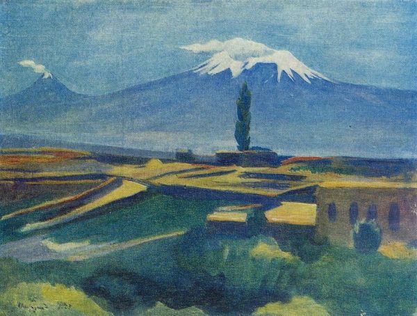 Curator: Looking at this scene by Martiros Sarian, I'm immediately struck by the contrast. The flat, almost geometric planes of the landscape clash so beautifully with the soft, snow-capped peaks in the distance. It's a painting called "View of Ararat from Yerevan," completed in 1923. Editor: It feels like a memory, doesn't it? A simplification of reality, imbued with a certain melancholy. The muted colors amplify that feeling; the blue sky seems heavy, as if pressing down on the land. It’s stark. Curator: That starkness might come from the political climate of the time. Sarian lived through immense upheaval, the Armenian genocide deeply impacted him. This view, Ararat, was a potent symbol of Armenian identity, even more so since it was, and still is, just outside of Armenia's borders, across in Turkey. Editor: Right, the idea of a homeland just out of reach adds another layer of emotional weight to the piece. I see the modernist influence here. He's stripping away the extraneous, focusing on fundamental shapes and colors to convey a sense of place, and perhaps, a longing. It transcends a simple landscape. The brushwork too feels deliberate, confident even in its simplicity. You feel a certain solidity in those structures; despite everything, a resilience in the very buildings and landscape. Curator: Absolutely, he distills the essence of the landscape. Look how he flattens the foreground, reducing the houses and trees to blocks of color. He's playing with perspective, inviting us to see Yerevan through his modernist lens and consider what permanence might still look like when everything else seems fragile. Sarian studied in Moscow and was well versed in the European avant-garde. And the echoes of Cezanne are quite loud here. Editor: You’ve got that right! A powerful expression of both cultural identity and the trauma of displacement then, wrapped in the deceptively simple beauty of a landscape painting. Curator: Precisely, an intimate connection to the land as a source of identity and hope. I always leave thinking more than I expected. Editor: Absolutely. It really speaks to how art can be both a reflection and a quiet act of resistance.