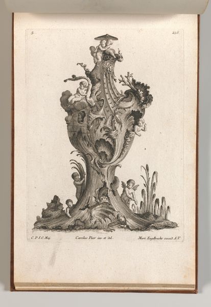 Curator: At first glance, I see exuberant, swirling forms—a real explosion of embellishment. Editor: Indeed! What you're seeing is Jacob Gottlieb Thelot's "Various Designs for Rocaille Ornaments, Plate 2 from an Untitled Series of Rocaille Ornaments for Frames," created sometime between 1745 and 1755. It's an etching and engraving, a study of rocaille ornamentation. Curator: The rocaille motif—derived from shells and rocks—feels like such a defining element of the Rococo. I’m immediately thinking about the culture of aristocratic excess it represented, the embrace of the fanciful and the artificial at the French court and across Europe. Editor: Absolutely. Beyond just mere opulence, these designs speak volumes about the era’s ambitions. Ornamentation in the Rococo was about displaying one’s sophistication. Look closely and you’ll notice how the patterns borrow organic forms from nature – stylized leaves, water droplets. These would have been laden with cultural significance, signaling power and learnedness. Curator: It’s remarkable how the Thelot translated these ornate elements to print. Each line conveys light and shadow, enhancing the three-dimensionality. One could easily imagine these elements adorning a grand salon, a mirror frame, or even furniture. How would an artist adapt these kinds of prints? Editor: I believe this plate would have served a primarily didactic function for other artists and craftsmen. Through their forms, they conveyed the sensibilities and the values of an era keen to establish aesthetic dominance. In the political landscape of 18th century, arts become weapons for displaying national prowess, reflecting aspirations, political structures, and commercial intentions. Curator: I’d agree—there's definitely an element of standardization. Now when I consider these decorative prints, I cannot help but imagine the workshops producing luxury items. This rocaille design shows not only artistry, but also reflects labor organization and market economy back then. Editor: And that brings the art to life. To look at design, to read into symbolism is really an invitation to see continuities. Curator: Yes, thinking about how tastes, political ambitions, and artistic skill coalesce, we better understand the 18th century and beyond.