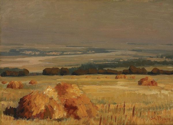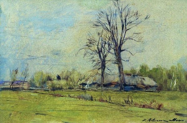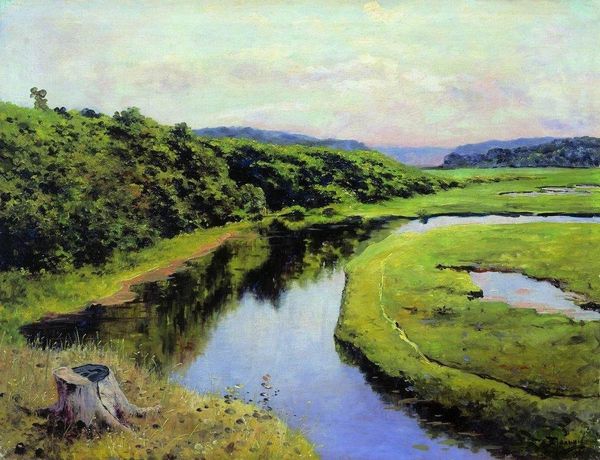 Editor: Here we have Isaac Levitan's "Village Khotkovo" from 1895, rendered in oil on canvas. There's a sense of quiet solitude that I get from it; the colors are muted, and the landscape seems untouched, almost melancholic. How do you interpret this work? Curator: It strikes me as a visual record of a changing rural landscape. Levitan, working during a period of rapid industrialization in Russia, presents us with Khotkovo, a village seemingly resisting those changes, at least on the surface. Consider the late 19th century: Russia was grappling with serf emancipation, burgeoning revolutionary movements, and the push-pull between agrarian tradition and modernity. Editor: So you're seeing the painting as more than just a landscape? Curator: Precisely. Look at the way the village is nestled into the landscape, almost hidden. It suggests a pre-industrial, communal way of life. But notice also the subtle signs of human presence, perhaps a path or the suggestion of cultivated land. What do these elements imply to you about Levitan's perspective on this period? Editor: Perhaps he is showing both the beauty and the vulnerability of the rural way of life? Was he maybe advocating for a slower, more nature-based approach? Curator: It's possible. His paintings were created around the same time as many different art movements in Russia such as the "peredvizhniki", and his artistic approach could reflect the contemporary values present in these art circles. Also remember, that Levitan himself experienced antisemitism. Perhaps, this landscape also carries the weight of exclusion and displacement that shaped his life and artistic vision. Editor: That context adds a whole other layer to my understanding! I saw serenity, but now I also recognize this work to hold complexities. Curator: Exactly. It’s about seeing the canvas as a site of intersectional narratives. Levitan offers not just a landscape but a complex statement on identity, society, and history. Editor: It gives me a lot to consider regarding art and social context. Thanks!