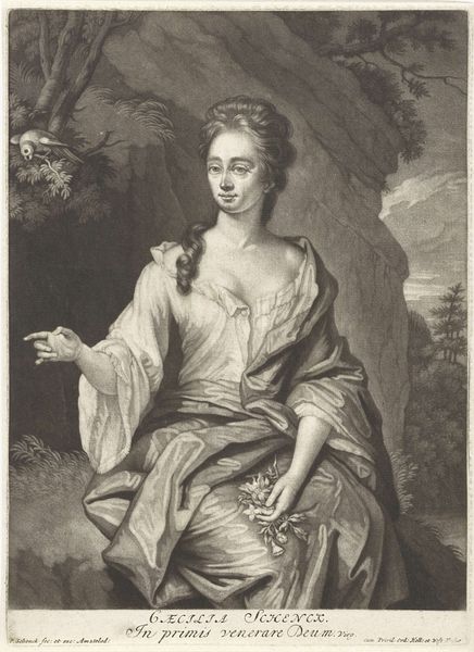 Curator: Oh, look at this print, a charcoal drawing titled "Isabella, Duchess of Grafton." It dates back to 1692. What are your first thoughts? Editor: It feels a little staged, doesn't it? Like she's mid-pose, caught in an artificial moment. The pointing finger…is she commanding something, or simply showing off? Curator: Ah, the symbolism! In Baroque portraiture, that gesture could signify her virtue, leading her family, perhaps even her destiny. Though I see your point. She's in command for sure, the image reeks of status. The drapey, opulent fabric of her gown alone whispers "privilege." Editor: True. It’s not just any fabric; it seems almost liquid in how it falls. Then you have the hair…the single braid. That's odd, no? Was it a specific symbol? Curator: Precisely! While elaborate hairstyles were en vogue, a simple braid could represent modesty, and even accessibility. It's an interesting contrast with the overt display of wealth. The background too with the barely-there, shadowy figure offers a surreal backdrop, highlighting that sense of crafted unreality. Editor: Shadows hiding things again, and I find my eye going back to her expression – slightly melancholy, perhaps? Does it hint at anything specific, like the weight of duty that comes with power and prestige, or even secret unhappiness? Curator: Absolutely! I think those slightly downturned eyes are critical. She presents strength but the soul seems like its just peeking through that perfect moment and revealing itself. The print acts as both a commemoration of the woman and her station in life as well as a window to what maybe a day in that woman's shoes looked like. It's interesting, what a little shading and tone can bring about in how we read a visual marker like this! Editor: Exactly. Well, now I can't stop imagining what a day in her shoes might have actually looked like...all this from one little gesture caught on charcoal, it seems. Curator: The power of symbolic portraiture at play! Fascinating, really, to unravel it all.