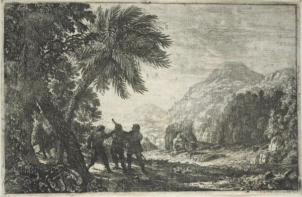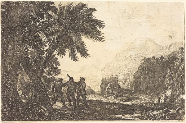Curator: Claude Lorrain's "Robbers" presents us with a complex interplay of light and shadow. The composition is carefully structured, with foreground figures leading the eye to a distant, ethereal landscape. Editor: The etching work is fascinating. The density of lines tells its own story about labor and the physical creation of this image. I wonder what tools and processes Lorrain employed to achieve such nuanced effects. Curator: The artist uses line to articulate form and depth, creating a sense of receding space and atmospheric perspective. Note how the delicate lines in the sky contrast with the bold strokes defining the trees. Editor: Exactly, but those stark contrasts also reflect the harsh realities of the depicted subject: robbery, survival, the daily grind of existence, maybe? Curator: Perhaps. The figures themselves are rendered with a classical restraint, their gestures suggesting a narrative without explicit drama. Editor: For me, the rough materials and manual labor speak to the everyday struggles of the figures depicted. Curator: It’s a study in contrasts, quite literally. Editor: Indeed. It prompts thoughts about how prints like this democratized art, making it accessible beyond the elite circles. Curator: Yes, a fascinating interplay of form and concept to consider.