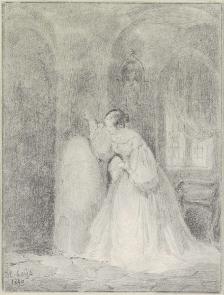Johannes Bosboom made this watercolor, "Interior with Standing Woman by a Column," in 19th-century Netherlands. It presents a woman in historical dress in a grand interior. The artwork is typical of Bosboom's interest in architectural spaces and their social atmospheres. Bosboom often depicted church interiors, reflecting the religious and cultural values of the time. This work fits into a broader 19th-century trend of historical and genre painting. Artists were interested in depicting scenes from the past or everyday life. The choice of subject matter often reflects a desire to evoke nostalgia or comment on contemporary society. The Rijksmuseum, where this work is held, played a crucial role in shaping Dutch national identity through its collection. Historians use resources like letters, exhibition reviews, and archival documents to understand the context of the artwork. Art isn't made in a vacuum, it is contingent on social and institutional contexts.
