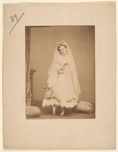 Pierre-Louis Pierson made this albumen silver print, entitled 'Le noeud de dentelle. "Ritrosetta"', some time in the mid-19th century in France. The image presents a woman adorned in an elaborate dress, complete with lace and a fan. It encapsulates the opulent fashion of the era, reflecting the values and aspirations of the French Second Empire. Pierson was known for his portraits of elite society figures, particularly those associated with the imperial court. This photographic print creates meaning through its detailed depiction of aristocratic fashion, presenting an ideal of beauty and status. France in the mid-19th century was a society sharply divided by class, and photography played a crucial role in shaping perceptions of social status. As historians, we look to sources such as fashion plates, social commentaries, and institutional records to better understand the ways in which this photograph both reflected and helped construct the social norms of its time. This image serves as a reminder that art is deeply intertwined with the social and institutional contexts in which it is created and consumed.