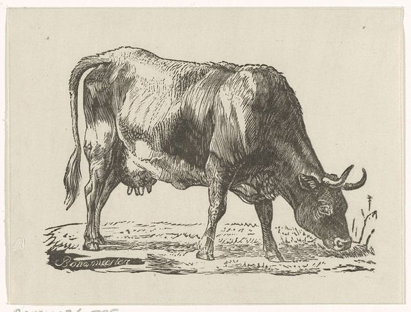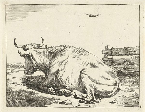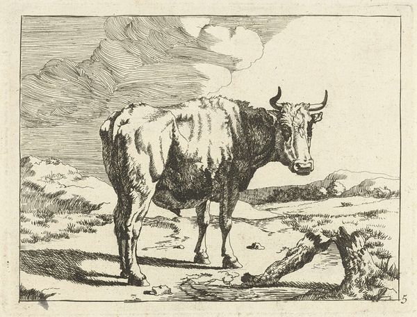Marcus de Bye etched this image of a standing cow, seen from the front, in the Netherlands sometime in the 17th century. Though seemingly simple, this image speaks volumes about the economic and social landscape of the Dutch Golden Age. The detailed rendering of the cow, set against a vast landscape, reflects the Dutch Republic's booming agricultural industry and its profound impact on the nation's identity. Cattle were not merely livestock; they were symbols of prosperity and national pride. The print's existence highlights the emerging art market, where even everyday subjects gained value and found their place in bourgeois collections. To fully appreciate this artwork, consider the archival records of Dutch trade, agricultural practices, and the societal values that elevated a simple cow to a subject worthy of artistic representation. This etching is more than just a picture; it's a window into a society undergoing profound economic and cultural transformation.